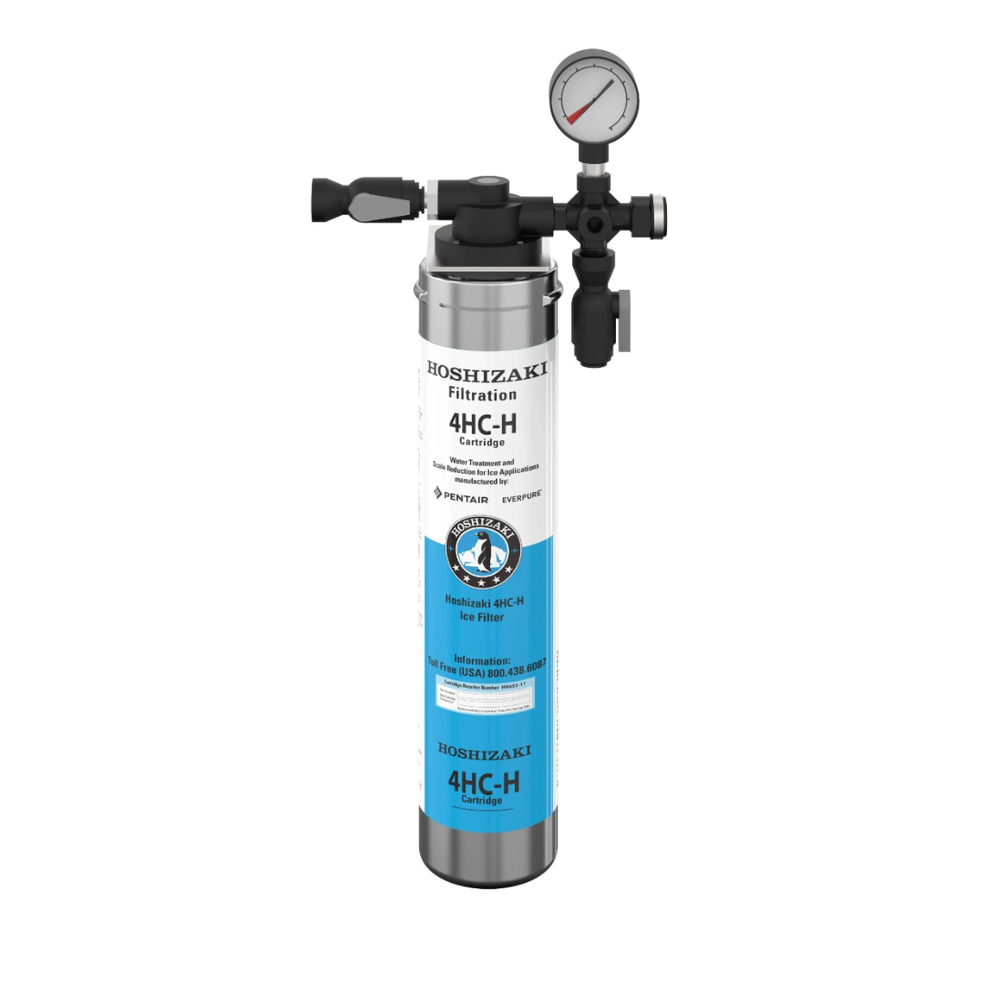 El sistema de filtración 4HC-H maximiza el rendimiento del equipo, mejora la calidad del hielo y filtra las particulas de tamaño de 1/2 micrón. Reduce el sabor del cloro, el olor, la formación de cal y los problemas de la corrosión debido a la evaporación del cloro.